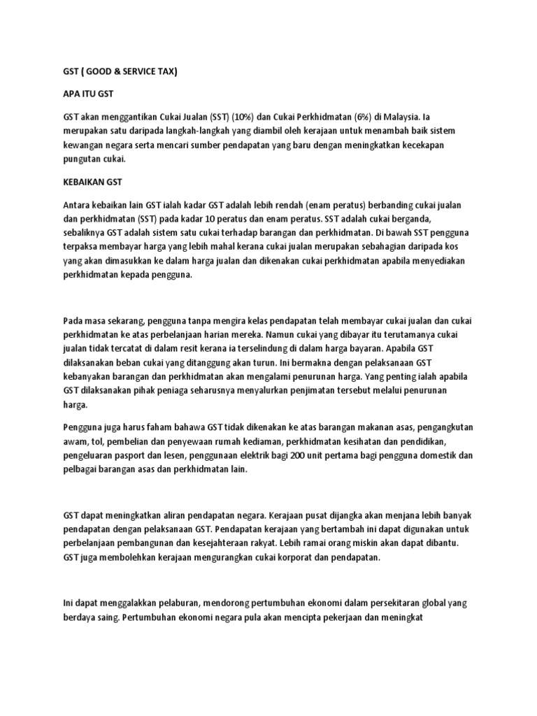 Goods and services tax, gst) atau cukai nilai tambah (bahasa inggeris: Taklimat cukai jualan dan perkhidmatan sst oleh menteri kewangan lim guan eng di putrajaya. Sst diperkenalkan menerusi akta cukai jualan 1972 dan akta cukai perkhidmatan 1975. Kerajaan mencadangkan kadar 10 peratus cukai untuk jualan dan enam peratus untuk perkhidmatan bagi cukai jualan dan perkhidmatan (sst) yang bakal diperkenalkan pada 1 september depan. Oleh sebab gst menggantikan cukai jualan dan cukai perkhidmatan sedia ada, maka pelaksanaan gst dijangka tidak akan menyebabkan berlakunya kenaikan harga barangan dan perkhidmatan, melainkan jika kadar cukai yang dikenakan adalah lebih tinggi daripada kadar cukai jualan dan.